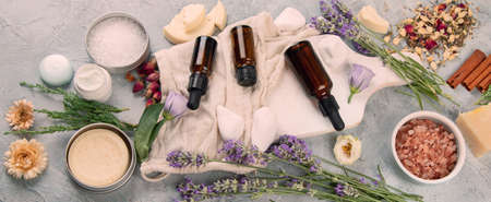 Bottle of essential oils with herbs and flowers on light gray background. Top view, flat lay, panorama, banner