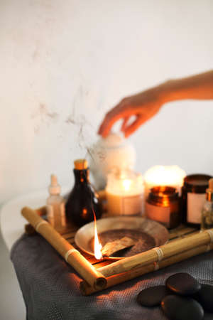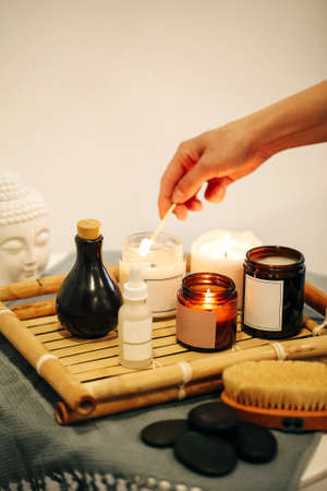 Faceless woman lighting candle in jar with burning chip above table with spa stones