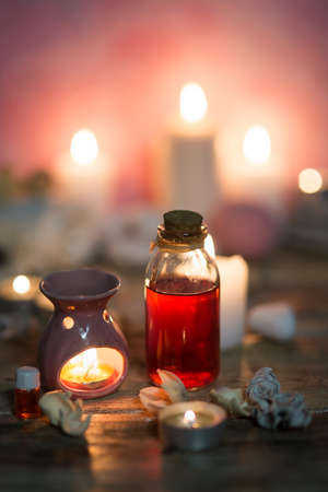 Bottles of dark glass with aromatic oils on the background of an aromatic lamp from candles.