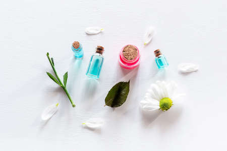 Organic spa skincare products with essential oil and spa massage stones top view on white wooden background. Spa treatment background.