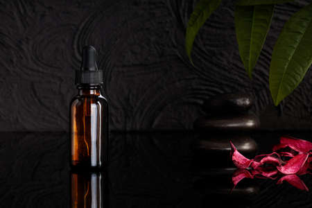 Mock-up of glass bottle with dropper. Brown container for skin care bottles on black background. Natural organic concept of cosmetic product. Minimalism, zen style. Bach therapy