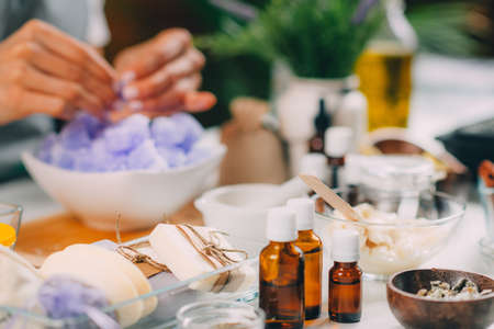 top view of woman holding bowl with dried lavender and serum while making cosmetics