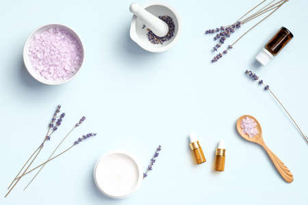 Set of natural lavender SPA cosmetic on blue background. Flat lay organic sea salt, lavender flowers, moisturizer cream and essential oil. Skincare and body treatment concept