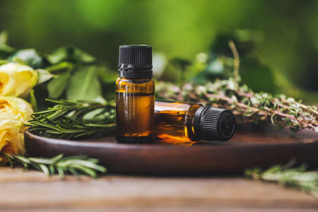 Aroma, two bottles of aromatic oil. Relaxation, beauty image.