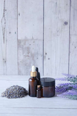 Glass bottle of Lavender essential oil with fresh lavender flowers wooden rustic table. Aromatherapy, spa, massage concept.