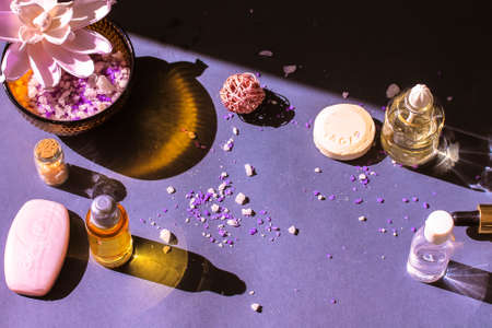 Beauty products, cosmetic bottles with essential oil contrasting shadows on blue, lotus flower, sea salt for bath top view. Spa treatment, wellness, relaxation, body, face care. Beautiful composition