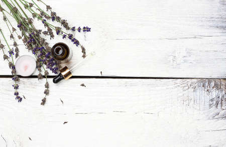 Still life, health and beauty, spa concept. Dry lavender and oil on a white wooden table. Selective focus, copy space background, top view
