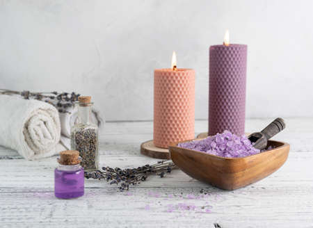 Natural herbal sea salt with aromatic lavender - perfect for relaxation. Cosmetic jars and bottles with salt, lavender flowers, bath bomb