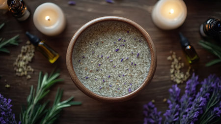 A serene lavender spa scene featuring a rustic wooden bowl filled with natural lavender ingredients, surrounded by candles, oils, and dried flowers.