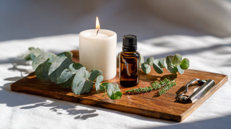 An arrangement features essential oil bottles, a lit candle, and a diffuser emitting steam. The composition showcases various botanical elements and soft lighting, creating a calm ambiance. Suitable for illustrating wellness, spa, or meditation concepts. It can also be utilized for cosmetic or aromatherapy promotion.