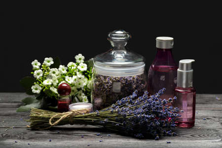Aromatic composition of lavender, herbs, cosmetics and salt on a dark table top