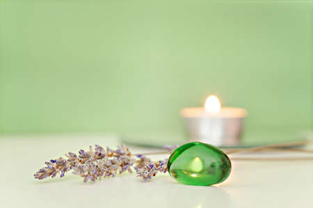Beautiful composition with lavender, semi-precious stone emerald and burning white candle, for aromatherapy and relaxation on a green background. Atmosphere of harmony and relax.