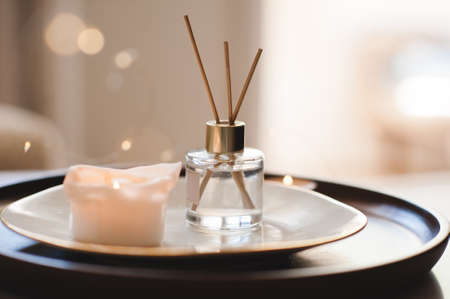 Home liquid scented fragrance in glass bottle with bamboo sticks on plate with burning candle in bedroom close up. Cozy atmosphere.