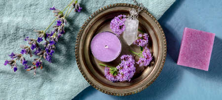 Aromatherapy panorama. Scented candle, soap and perfume vial, shot from the top with vervain and lavender flowers
