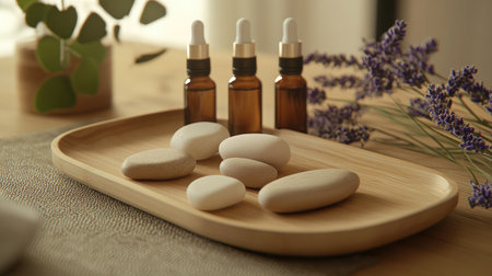 A serene composition featuring smooth stones, essential oils, and lavender, creating a peaceful spa atmosphere, perfect for relaxation and personal wellness routines.