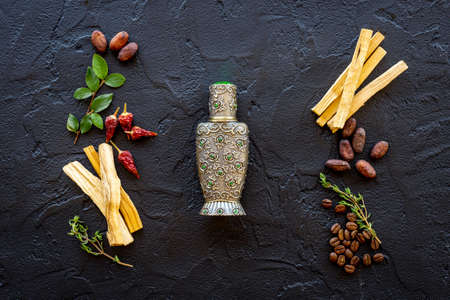 Agar wood tree oil perfume in silver bottle with sticks of tree