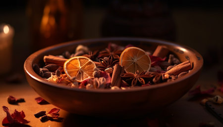 Aromatic citrus slice and spice seasoning for gourmet winter dessert generated by artificial intelligence