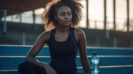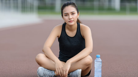 A young athletic woman sits on a track, reflecting after an intense workout. A water bottle beside her emphasizes hydration and post-exercise relaxation, highlighting a healthy lifestyle.