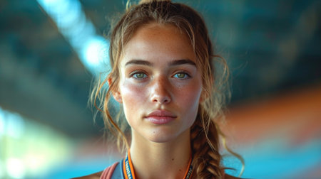 Triumphant female athlete with a medal in a stadium, symbolizing athletic success and determination.