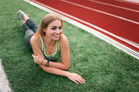 Portrait of attractive sporty young woman with towel around her neck walking along the track at stadium on a sunny day