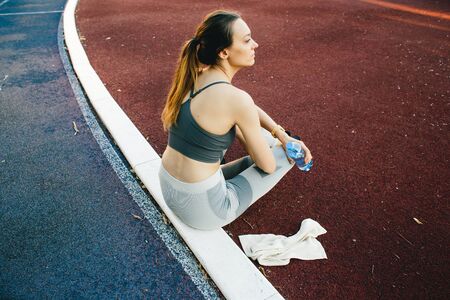 young beautiful blonde sits on a jogging track with a bottle of water in her hands