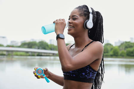 Happy pretty young Black fit woman in heaphones drinking fresh water after training outdoors