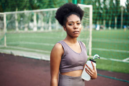 Young black woman in a tracksuit stands on the sports ground and holds a bottle of water. Healthy lifestyle concept. Outdoor.
