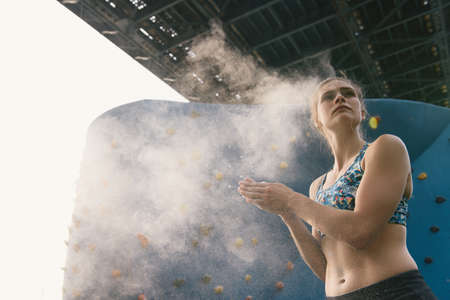 Young woman dusting hands, preparing to use climbing wall, Brooklyn Bridge Park, Brooklyn, New York, USA