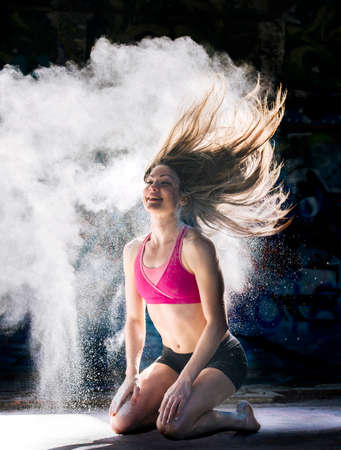 Beautiful girl in sportswear is using talcum powder for her hands and looking at camera, on gray background