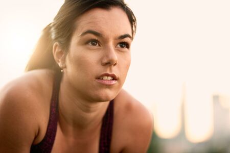 Portrait of active millenial woman jogging at dusk with an urban cityscape and sunset in the background
