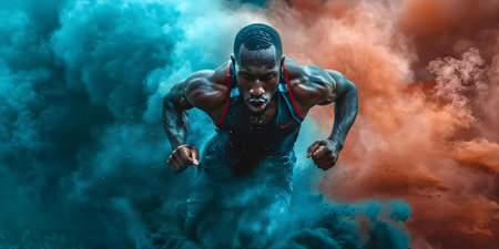 Heroic double exposure photo of a well trained runner speedy running. Generative AI AIG19.