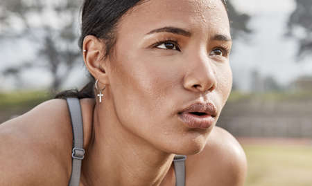 Sweating, tired and cardio with portrait of woman for workout, performance and fitness. Breathing, fatigue and training with low angle of person outdoor for exercise, sports and wellness challenge