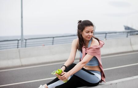 Athletic young woman in sports outfit after jogging, doing sports in the fresh air, drinks water from a bright green bottle, sitting on the parapet of the bridge, against the backdrop of white sky.