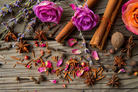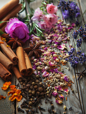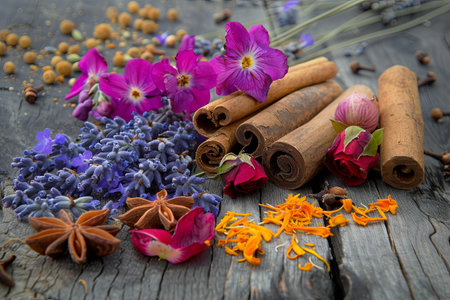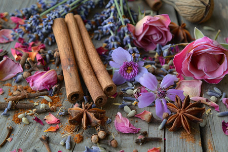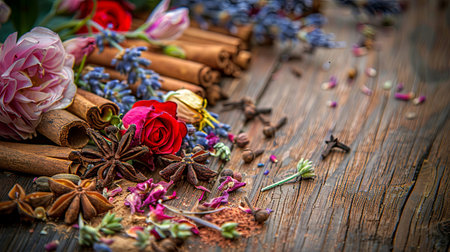 A captivating arrangement of fragrant spices and fresh flowers. Cinnamon sticks, star anise, and cloves mingle with lavender sprigs and rose petals on a warm wooden surface.