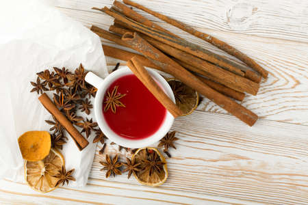 Tasty drink with cinnamon, anise and cloves in cup on light background