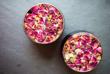 Dried colorful flowers arranged in a white bowl on a rustic wooden table, with scattered petals and natural elements around. Concept of nature