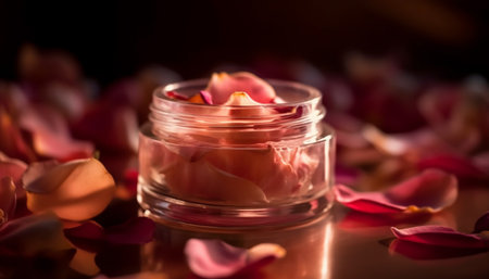 A serene cup of tea nestled among pink rose petals creates a calming atmosphere. The delicate floral arrangement adds beauty and elegance, perfect for relaxation and aesthetic enjoyment.