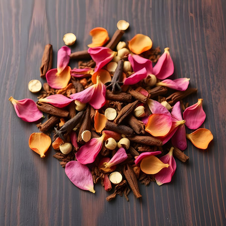 A delicate mix of dried spices and flowers, arranged artistically on a dark wooden surface.