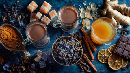 A vibrant display of herbal teas, spices, and ingredients includes ginger, chocolate, and sweet confections arranged on a blue surface, creating a warm and inviting atmosphere.