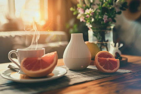 Warm sunlight streams through the window, illuminating a cozy setting. A steaming cup of tea sits beside vibrant grapefruit slices, while a diffuser adds a touch of relaxation to the atmosphere.