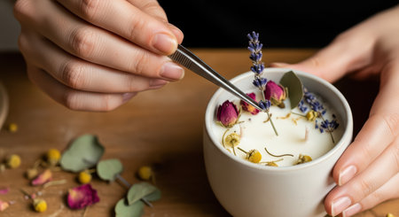 Hands arranging dried flowers and herbs in candle on wooden table