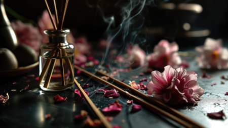 Diffuser with scented sticks and flowers on a dark surface