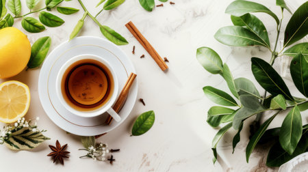 a cup of herbal tea cinnamon sticks on a saucer lemon teapot and leaves on a white table generative ai