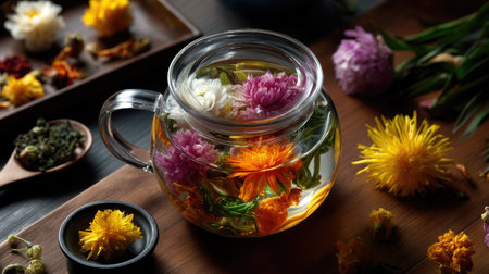 A vibrant glass teapot filled with herbal tea and fresh flowers sits elegantly on a wooden surface, showcasing a delightful and healthy beverage option.