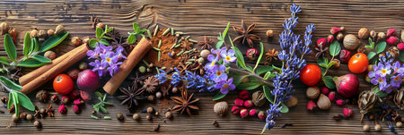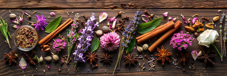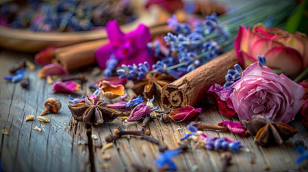 A rustic wooden surface is adorned with a colorful arrangement of fragrant spices and fresh flowers, including cinnamon sticks, star anise, cloves, lavender sprigs, and rose petals.