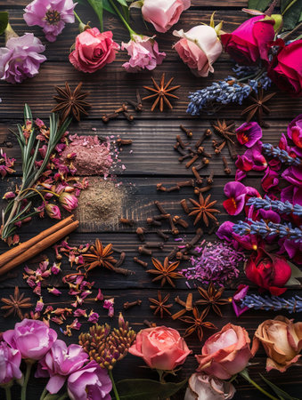 A captivating arrangement of fragrant spices and fresh flowers, including cinnamon, star anise, cloves, lavender, and rose petals, displayed on a rustic wooden surface.