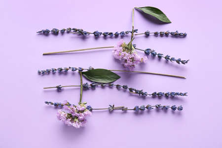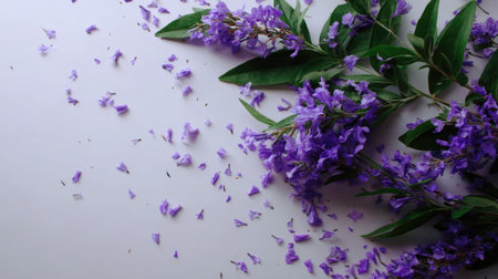Flat lay composition featuring a bouquet of vibrant purple flowers and their scattered petals on a light-colored surface. The petals and flowers are arranged in a somewhat random, yet visually appealing, pattern. The color palette is a soft, elegant purple against a soft background. The image is well-lit and captures the delicate beauty of the flowers in detail.
