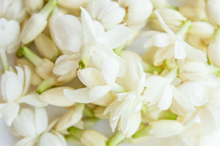 Asian woman hands holding white jasmine flowers, selective focus on the white flowers