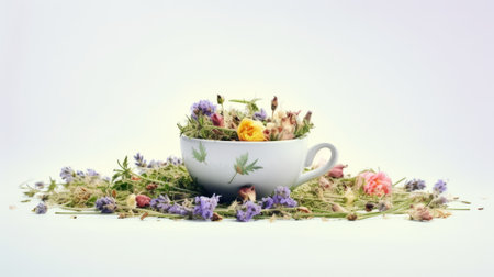 a white teacup filled with an arrangement of flowers and greenery on a white background.igh resolution AI generated