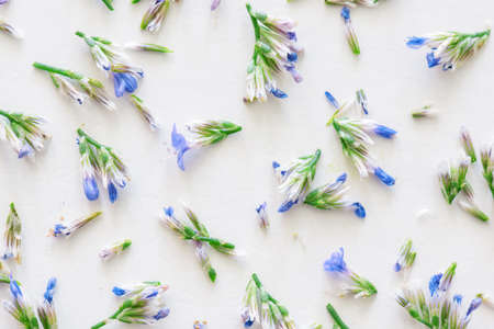 Beautiful blue spring flowers on white background. Top view of flower pattern. Wonderful spring composition. Flat lay of flowers.